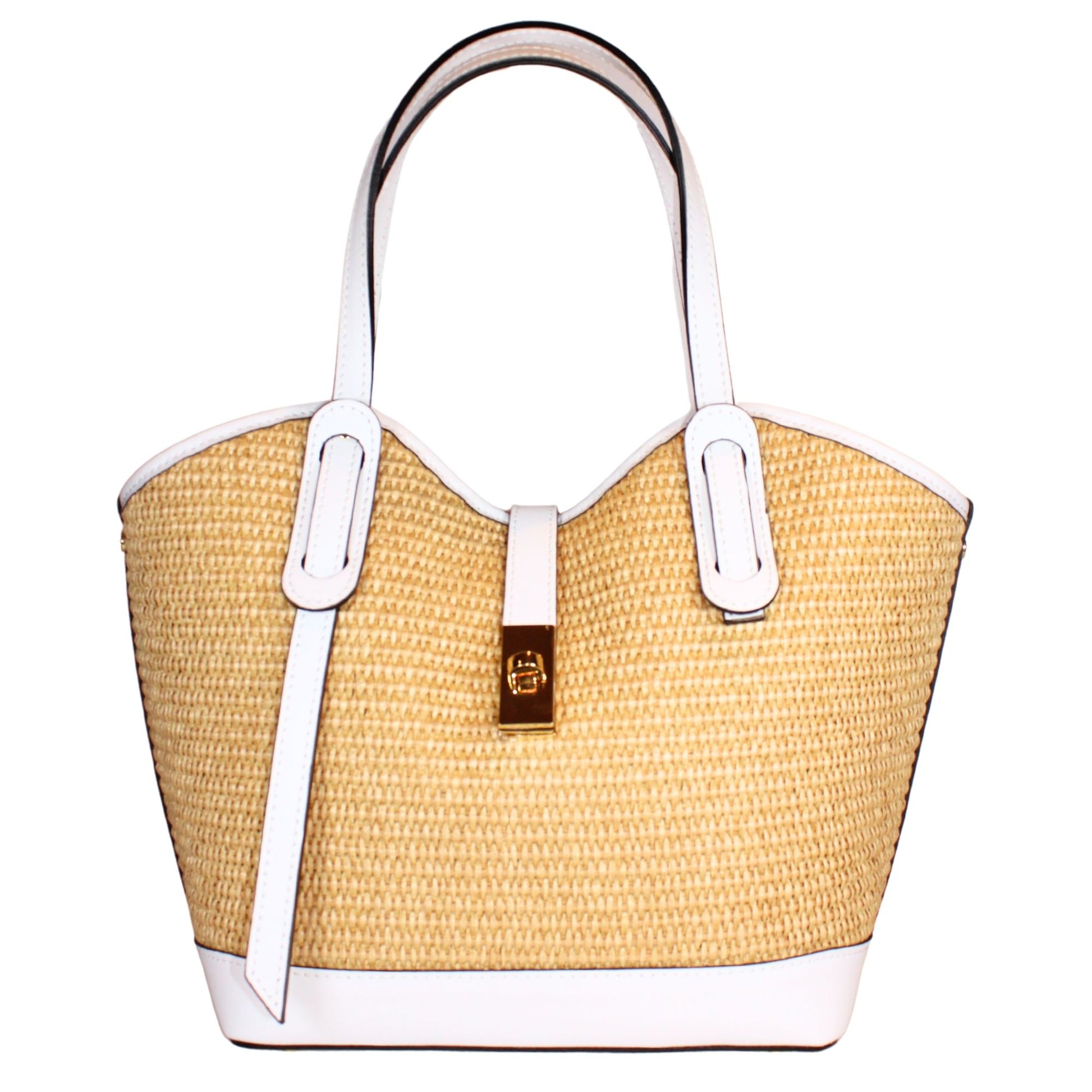 Borsa in rafia intrecciata a mano con tracolla lunga regolabile in pelle. Dispone di due tasche interne e un compartimento principale con chiusura a cerniera. Dettagli placcati oro per una finitura resistente e brillante. Made in Italy.
