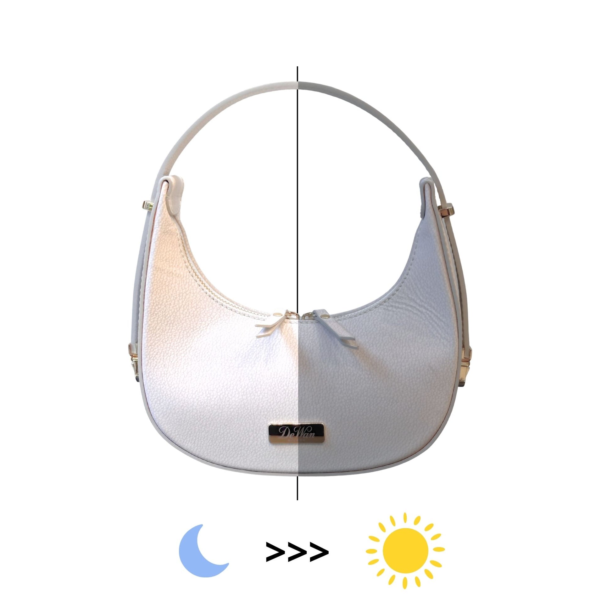 Borsa a mezzaluna in vera pelle fotocromatica liscia Made in Italy, che reagisce ai raggi UV cambiando colore in modo automatico e rapido, anche nelle giornate nuvolose. Una volta rimossa dall’esposizione al sole, ritorna gradualmente al colore originale in circa 5 minuti.